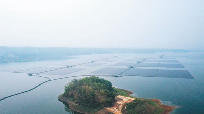 在印度尼西亚西爪哇省芝拉塔水库拍摄的中企承建芝拉塔漂浮光伏项目。 新华社记者 徐 钦摄